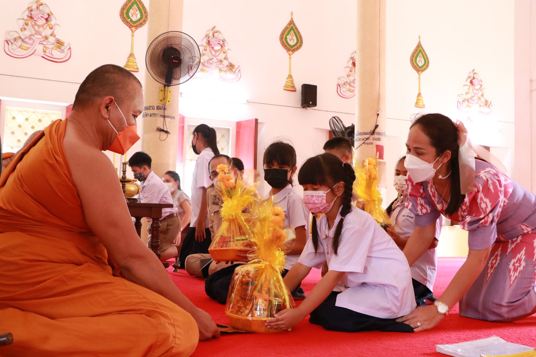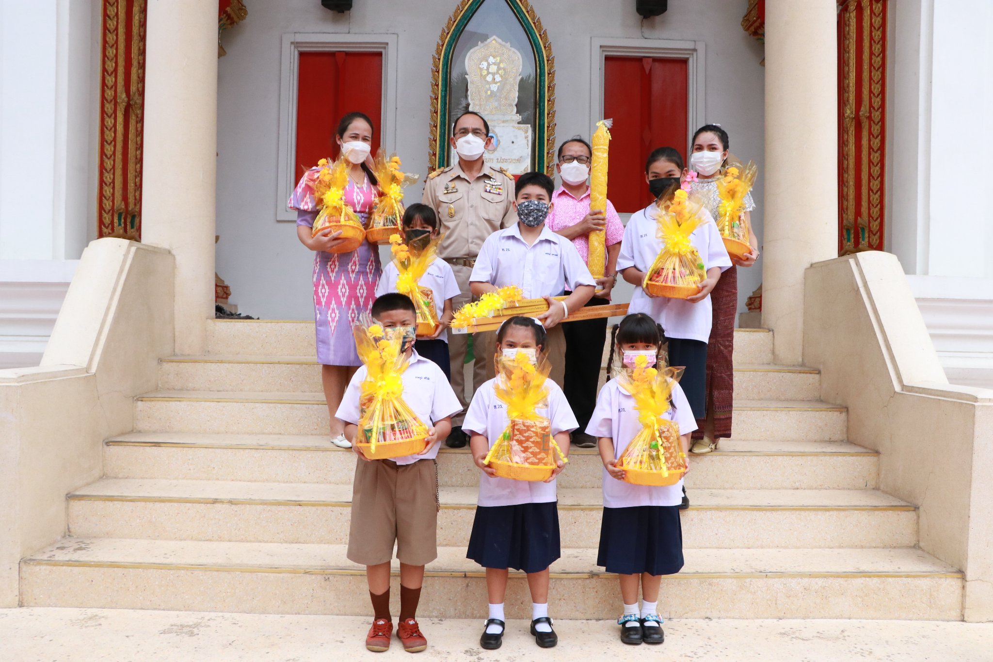 นายเอกชัย สาโรจน์ ผู้อำนวยการสถานศึกษา นำตัวแทนคณะครูและนักเรียนสายชั้นประถมศึกษาปีที่ 1-6 เข้าถวายถวายเทียนพรรษา